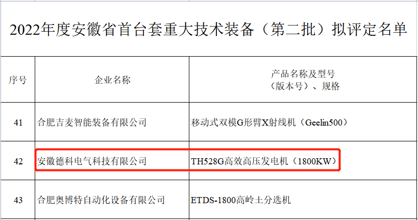 为鼓励和支持首台套重大技术装备的研制和应用,加快我省装备制造业转型升级,推动制造强省建设,根据《安徽省经济和信息化厅关于印发<安徽省首台套重大技术装备首批次新材料首版次软件评定管理暂行办法>的通知》,经企业申报、所在市经信主管部门审核推荐、第三方评定机构组织专家评审、公示等程序,评定博天堂网址TH528G高压高效发电机等116套装备为2022年安徽省第二批首台套重大技术装备。