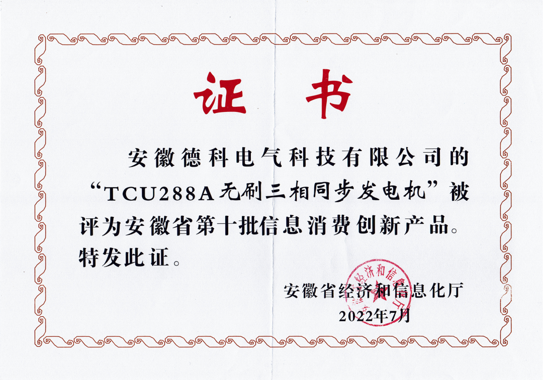 根据《安徽省新产品认定暂行办法》(皖经信科技函120171880号),安徽省经济和信息化厅组织开展了2022年第一批安徽省新产品认定工作。经专家评审,认定安徽博天堂网址电气科技有限公司〝TCM428D船用发电机〞 等113项产品为2022年度安徽省新产品。