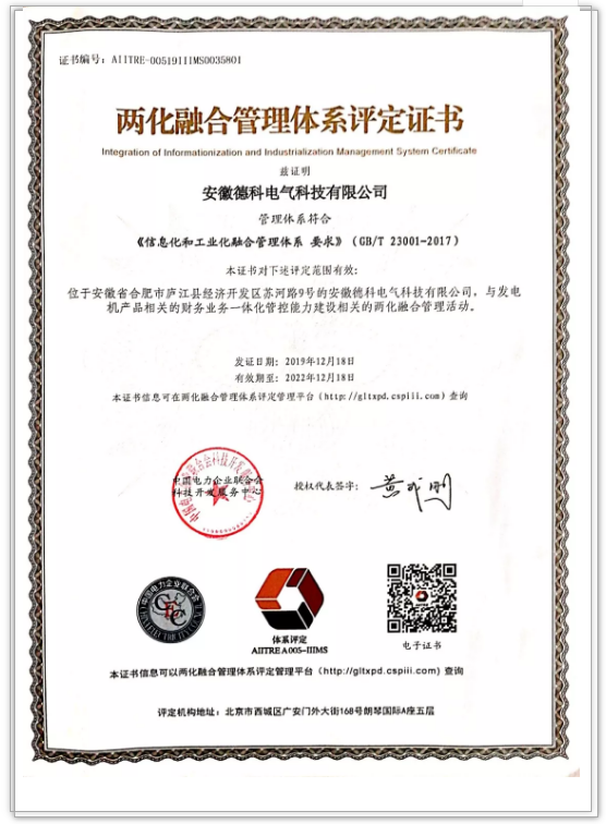 “两化融合”是工信部推行的国家战略,是信息化和工业化在技术、产品、服务、管理等各个层面的深度结合。作为提升企业核心竞争力的战略性工具,“两化融合”对推动公司的创新发展具有深远的意义。2019年,安徽博天堂网址电气科技有限公司根据国家《信息化和工业化融合管理体系要求》(GB/T 23001-2017)标准,经过自主申报、体系运行、内部审核、管理评审、专家评审和复核公示等环节,于近日正式通过评定,取得了两化融合管理体系评定证书。