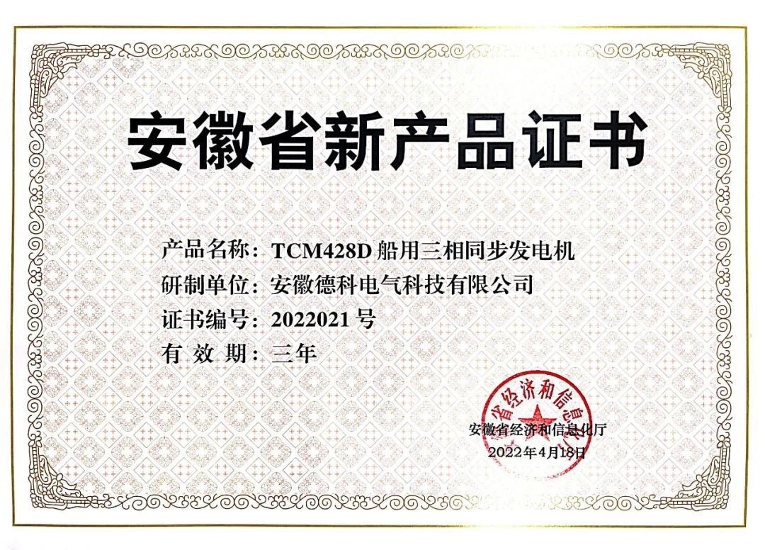根据《安徽省新产品认定暂行办法》(皖经信科技函120171880号),安徽省经济和信息化厅组织开展了2022年第一批安徽省新产品认定工作。经专家评审,认定安徽博天堂网址电气科技有限公司〝TCM428D船用发电机〞 等113项产品为2022年度安徽省新产品。