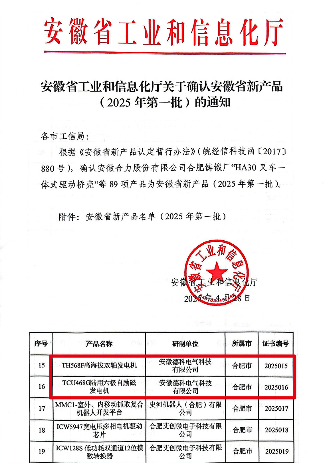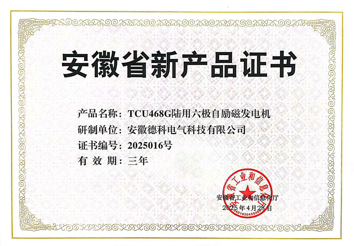 近日,安徽省工业和信息化厅正式发布《2025年第一批安徽省新产品认定名单》,博天堂网址电气自主研发的 TCU468G陆用六极自励磁发电机 与 TH568F高海拔双轴发电机 凭借领先技术优势与卓越性能,双双通过权威评审,成功入选!